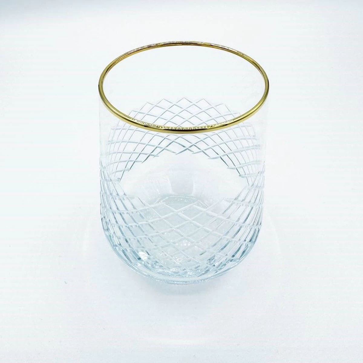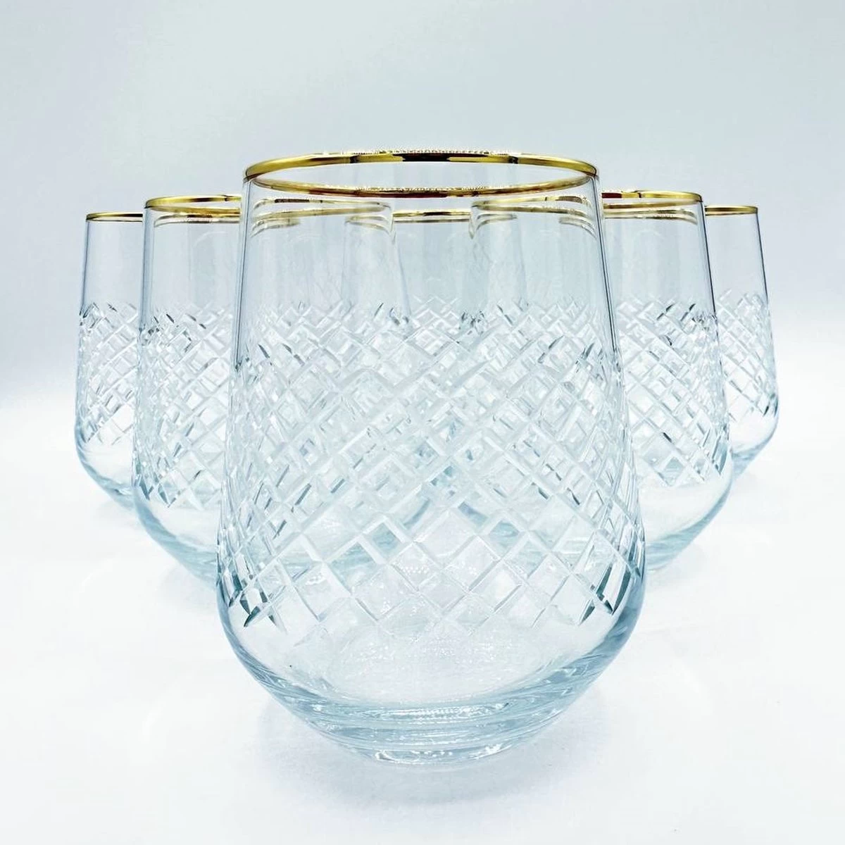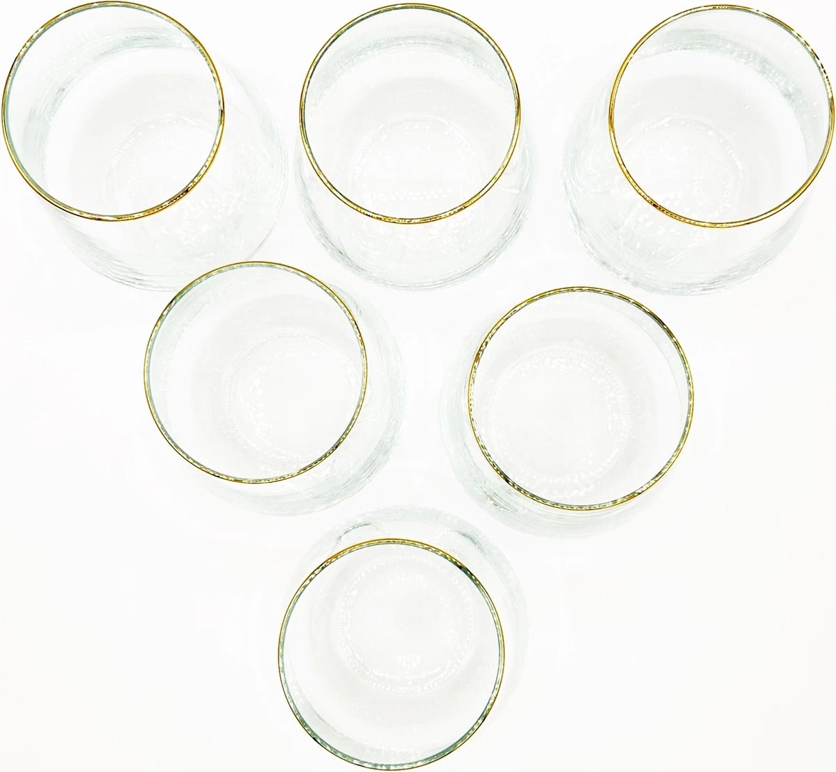 - Handgesneden transparante glazenset van gehard glas met gouden rand en minimalistische decoratie bestaande uit 6 stuks