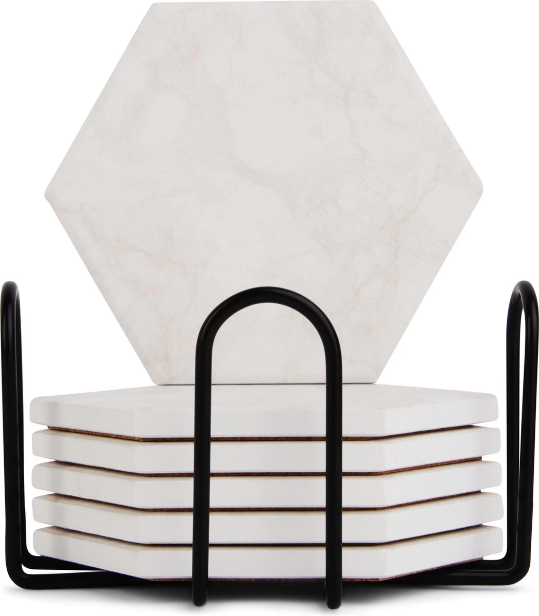 De onderzetters zijn gemaakt van hoogwaardig keramiek dat condens van de drankjes perfect absorbeert waardoor kringen op tafel voorkomen worden. De toplaag van de keramiek is voorzien van een anti-plak oppervlak zodat de onderzetters niet aan de glazen blijven plakken. Daarnaast zijn de onderzetters hittebestendig, waardoor ze ook voor kopjes thee en koffie gebruikt kunnen worden. Om krassen op tafel te voorkomen is de onderkant van de onderzetters voorzien van kurk. Het kurk zorgt er ook voor dat de onderzetters goed op hun plek blijven liggen.