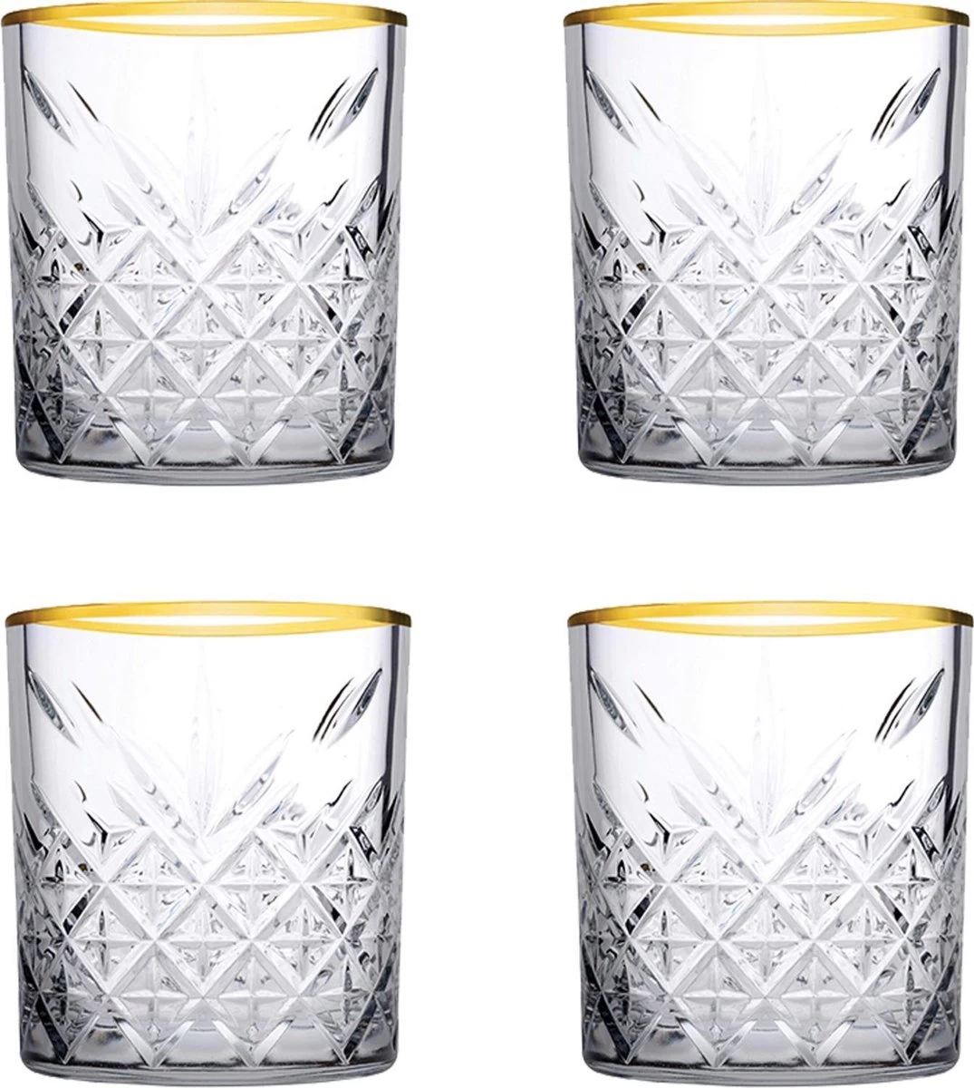 Deze opvallende waterglazen met chique gouden rand uit de serie Timeless hebben een prachtig rechte vorm, waardoor ze fijn in de hand liggen. Met hun bijzondere hoekige glasbewerking maken zij iedere frisdrank of cocktail tot een ware traktatie. De glazen hebben een dikke bodem, wat ze een robuust en stoer karakter geeft. Daarnaast zijn deze glazen gemaakt van extreem sterk glas. Met deze waterglazen heb je voor ieder moment op de dag de juiste glazen in huis. Deze set bestaat uit 4 waterglazen met een inhoudsmaat van 35,5 cl.