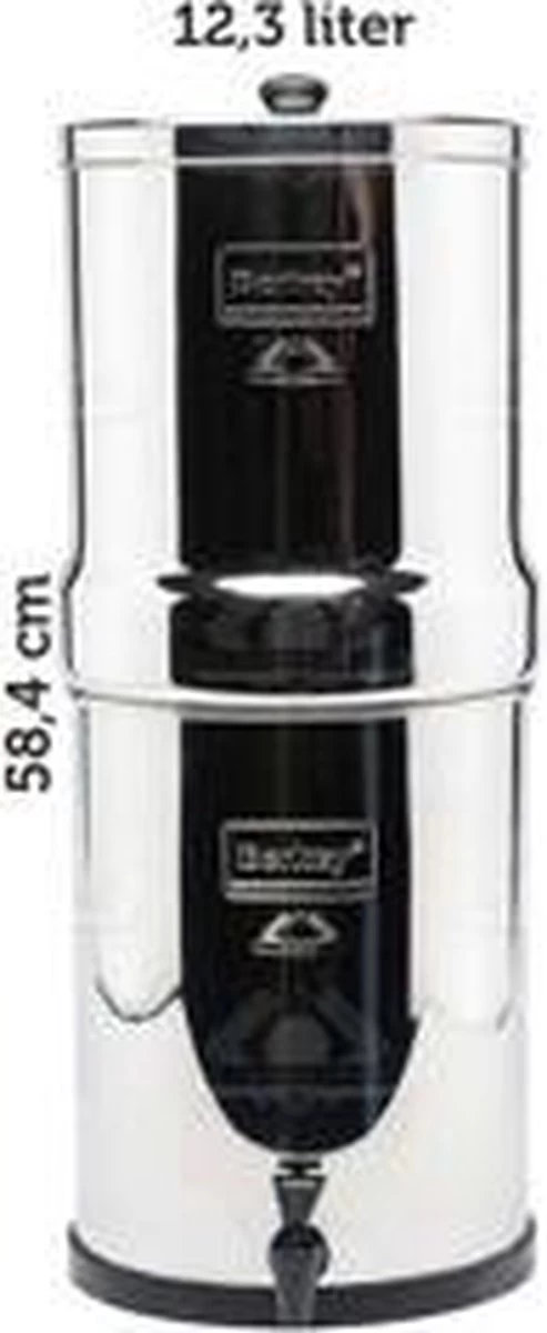 De Royal Berkey is geschikt voor 2 – 6 mensen en heeft een opslag capaciteit van 12,3 liter. Opgesteld met 2 Black Berkey waterfilters kan de Royal Berkey 15,1 liter water per uur zuiveren. De doorloopsnelheid van het water is berekend voor een vol bovenste vat. De doorloopsnelheid vermindert wanneer het waterniveau in het bovenste vat lager wordt. Het is ondoenlijk om het bovenste vat altijd vol te houden, dus de doorloopsnelheden zijn in de praktijk altijd lager dan hier vermeld.