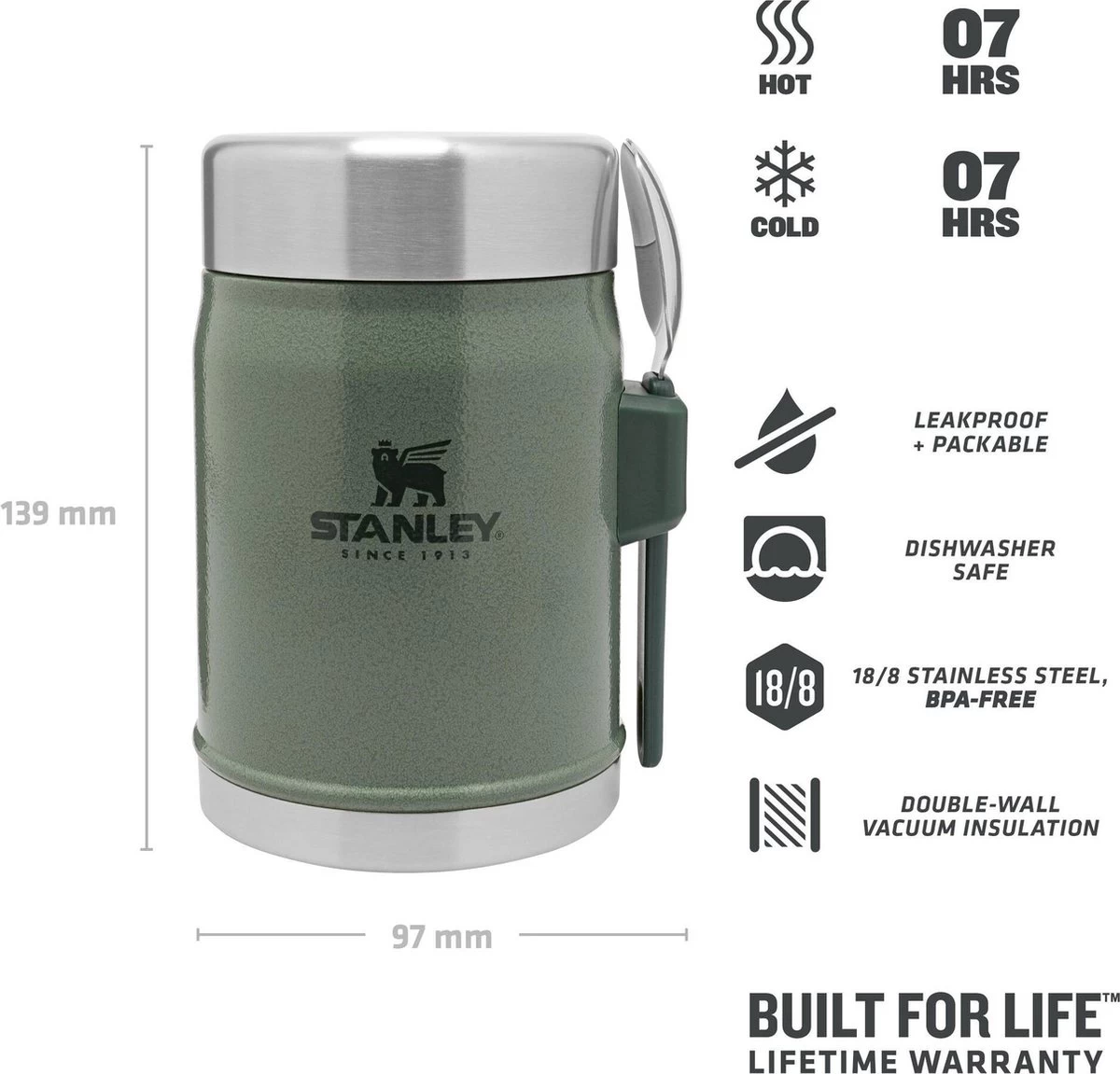 Stanley Classic Legendary Food Jar 0.4L / 14 OZ Hammertone Green met spork – Foodjar houdt 7 uur warm, of koud | Levenslange garantie | Dubbelwandige Isolatie | Lekvrij | BPA-vrij