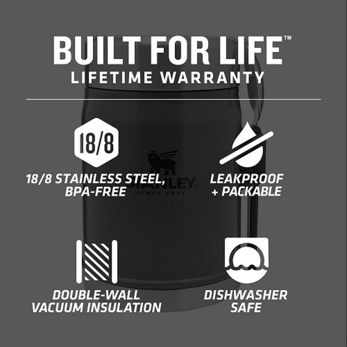 LEKBESTENDIG: De Stanley thermosfles voor voeding is voorzien van een lepel en vork in één. De Adventure all-in-one food jar is speciaal ontworpen met een lekproof deksel, zodat je hem makkelijk in je rugzak kunt stoppen zonder te morsen. De brede opening aan de bovenkant maakt vullen, gieten en reinigen eenvoudig.
